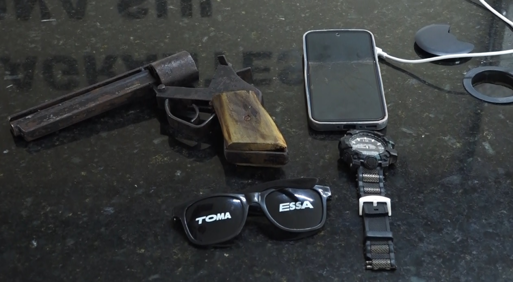 Um revólver e um aparelho celular foram apreendidos no local.