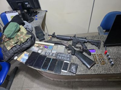 Dois homens foram presos e um terceiro conseguiu fugir. Na ação, foram apreendidas armas de fogo, um simulacro de fuzil, aparelhos celulares roubados das vítimas, além do veículo utilizado na prática criminosa.