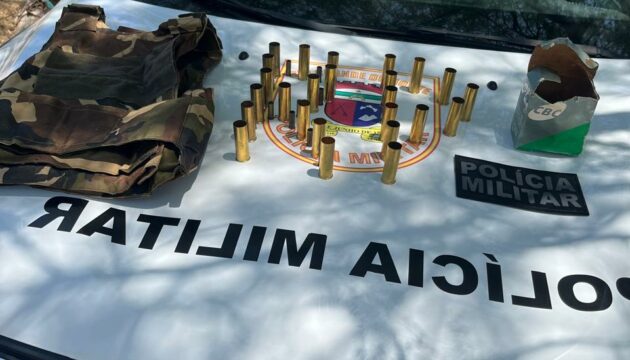 Em um serrote de pedras, escondido em meio à vegetação, os policiais localizaram uma capa tática de colete balístico camuflado, uma caixa lacrada de estojos originais CBC calibre 12 e diversas cápsulas deflagradas de calibre .38.